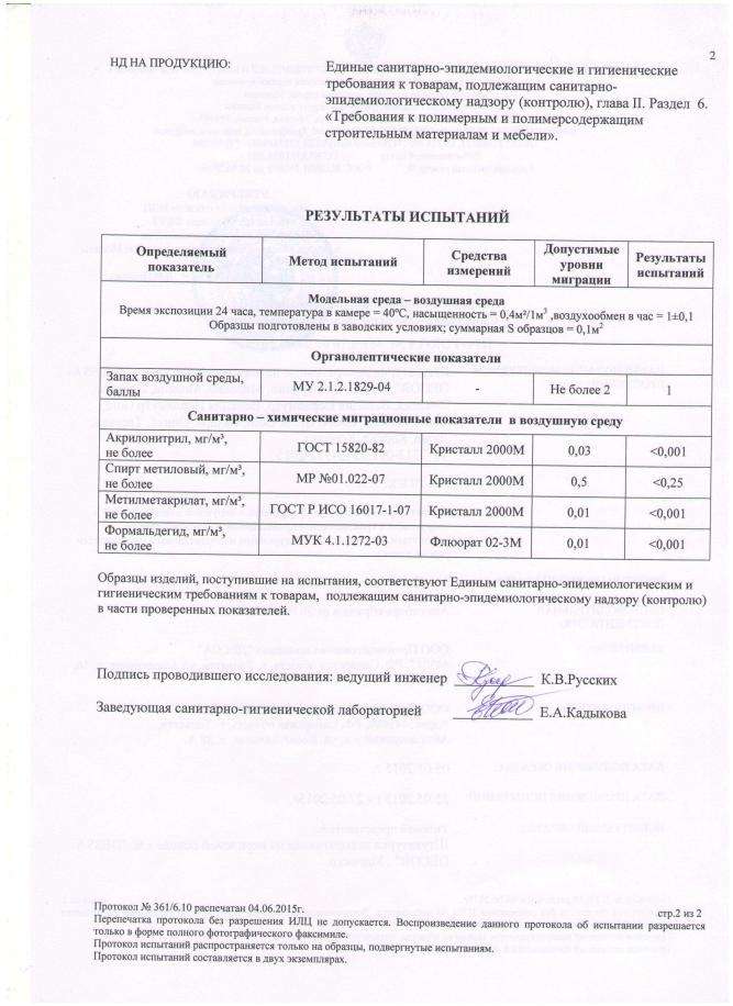 Протокол испытаний центра гигиены, лист 2