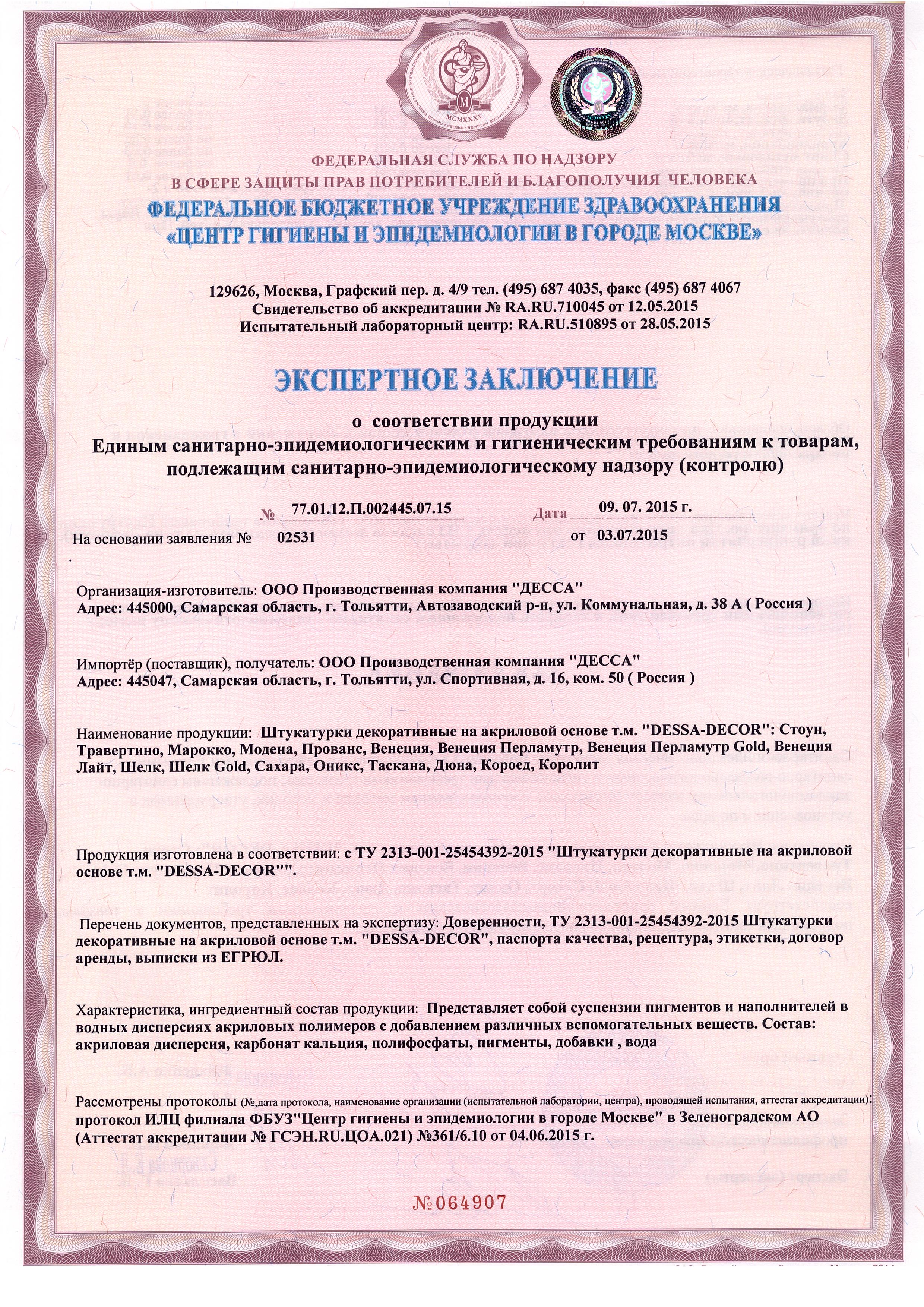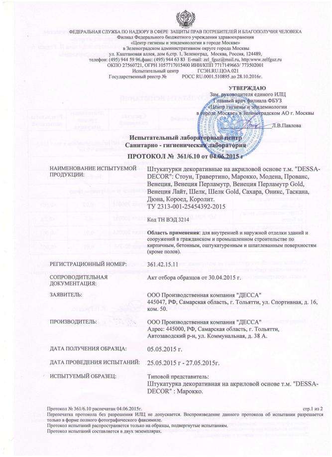 Санитарно-гигиенический сертификат, лист 1